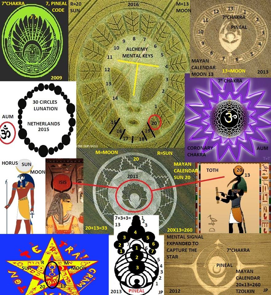 BASTA LER O APOCALIPSE 20 E TIRAR AS CONCLUSÕES SOBRE O SIGNIFICADO MAIS PROFUNDO DESTE ARCANO, QUE ESTÁ SENDO REPRODUZIDO EM MUITOS CROPS CIRCLES, DE DIVERSAS MANEIRAS, TODOS RETRATANDO CABEÇAS COM AURAS BRILHANTES, SÓIS SE ERGUENDO PELA PORTA CORONÁRIA, CUJA CHAVE É A GLÂNDULA PINEAL ATIVADA.