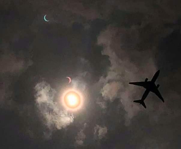 Na imagem do avião, a Lua é registrada logo após o eclipse, fase nova.