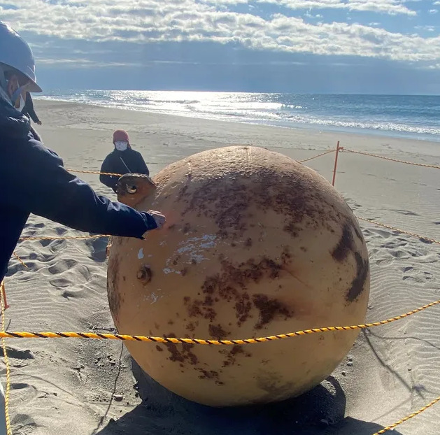 Uma esfera de metal de cerca de 1,5 metro de diâmetro apareceu na terça-feira (21) em uma praia na cidade de Hamamatsu, no Japão, e as autoridades do país ainda não sabem o que é o objeto.