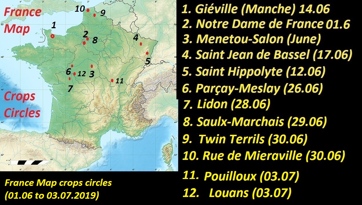 Ora, a série de crops circles que alcançou a França desde o primeiro dia de Junho, mostrando alinhamentos, pode explicar o por que deste país ser um dos mais afetados por tal onda de calor, além daquele terremoto incomum perto de Nantes, justamente no dia do soltício de Verão, quando a estação começou no hemisfério norte.